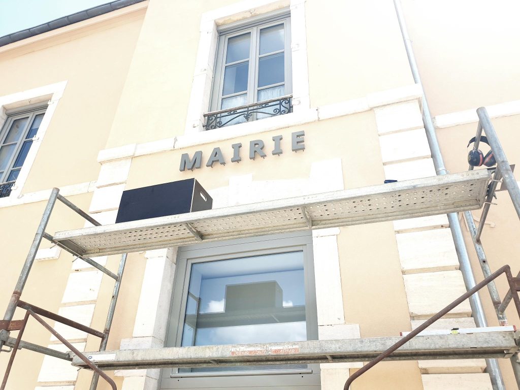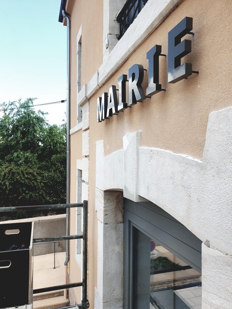 Lettrage Mairie – Lettres creuses découpe laser, soudage Tig Inox 2mm thermolaquées