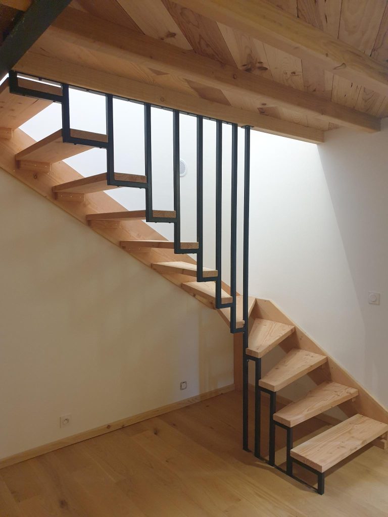 Conception d’un escalier balancé sur-mesure avec limon centrale tubulaire. Support de marche en rond plein.
